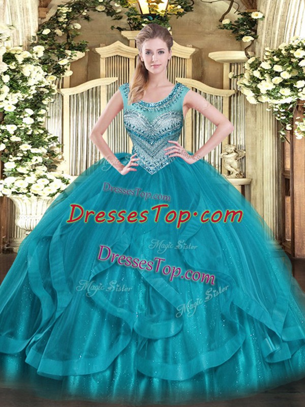 Teal Sleeveless Tulle Lace Up 15th Birthday Dress for Sweet 16 and Quinceanera