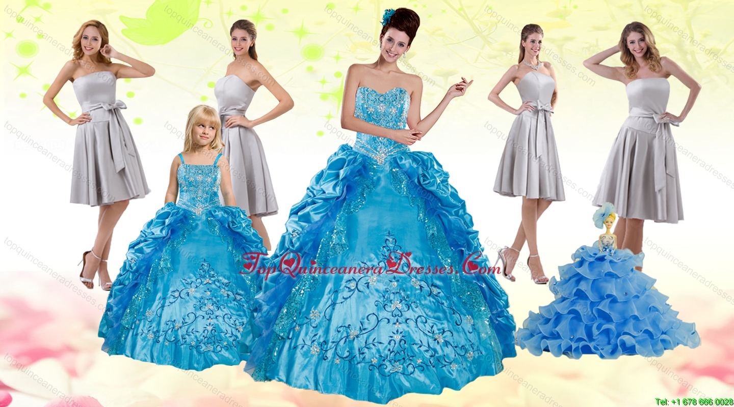 Teal Sweetheart Embroidery Quinceanera Dress and Strapless Short Dama Dresses and Spaghetti Straps Ruffles Flower Girl Dress