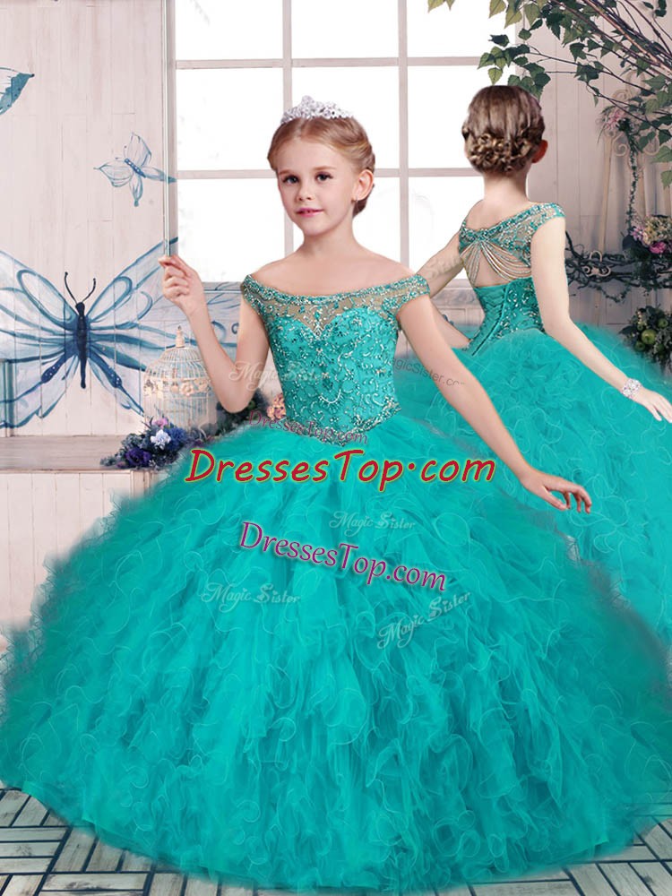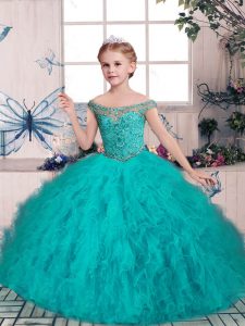 Teal Tulle Lace Up Little Girl Pageant Dress Sleeveless Floor Length Beading
