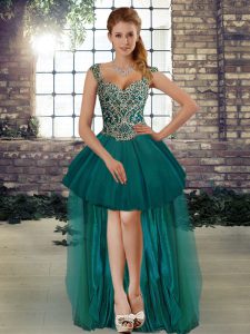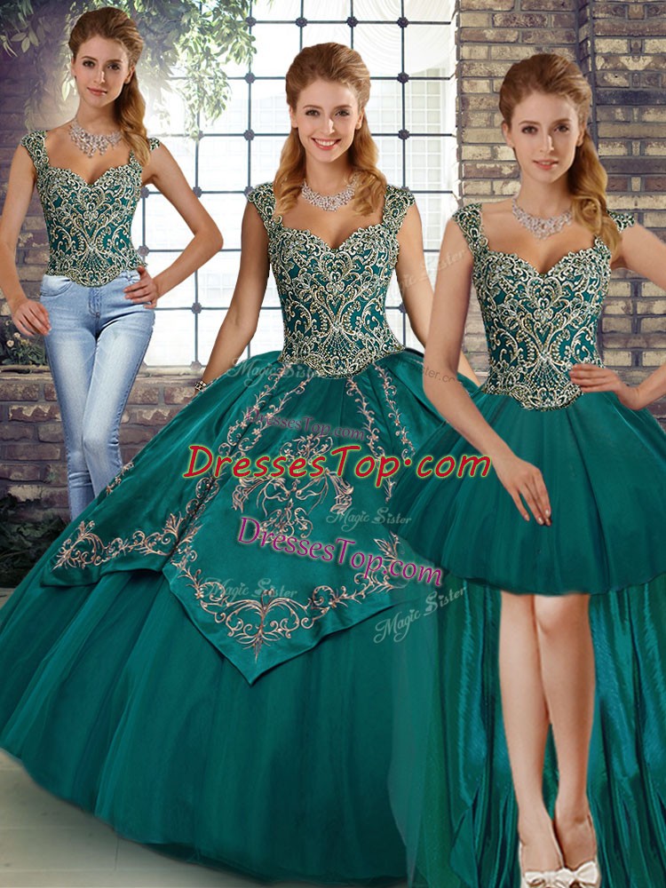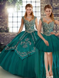 Teal Tulle Lace Up Straps Sleeveless Floor Length Ball Gown Prom Dress Beading and Embroidery