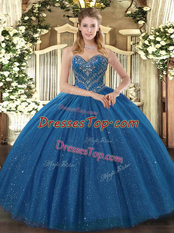 Teal Tulle Lace Up Sweetheart Sleeveless Floor Length Quinceanera Gown Beading