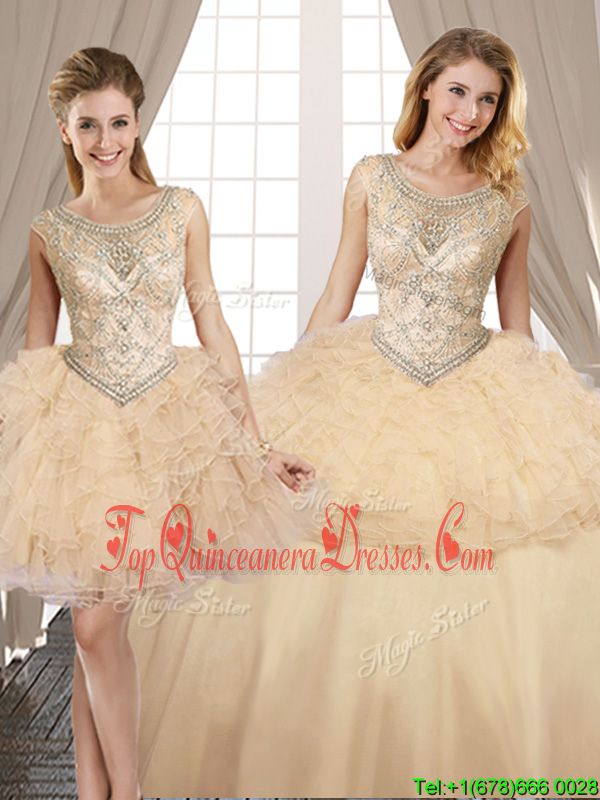 Three Piece Floor Length Champagne Quinceanera Dresses Scoop Sleeveless Lace Up
