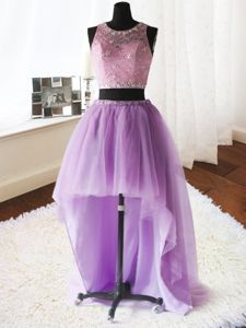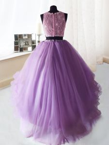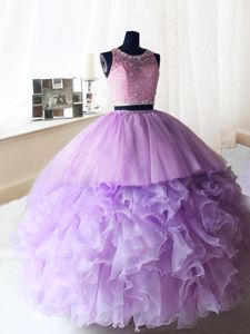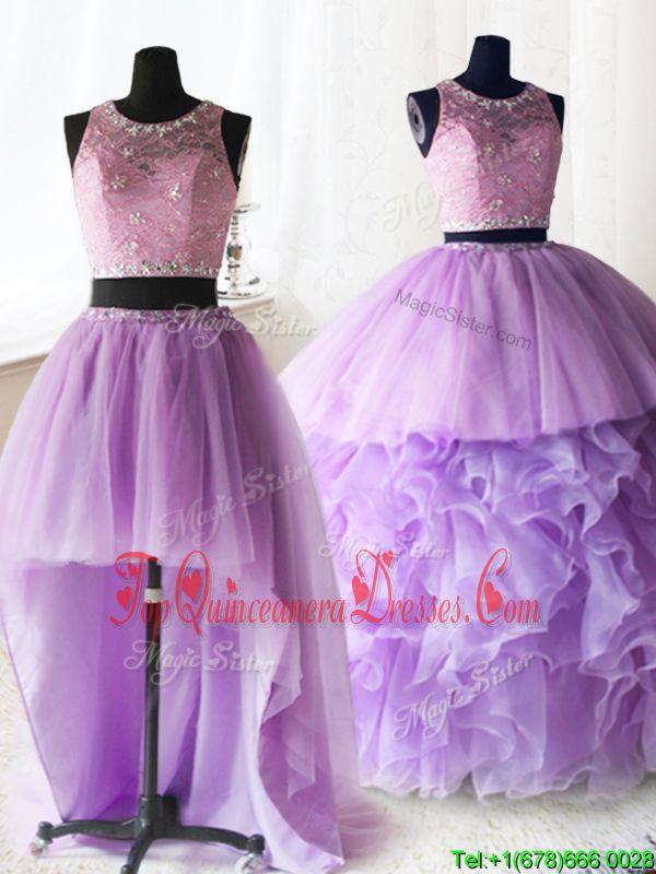 Three Piece Scoop Sleeveless With Train Beading and Lace and Ruffles Zipper Quinceanera Gowns with Lilac Brush Train