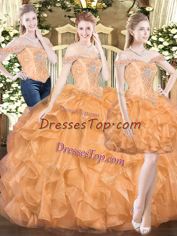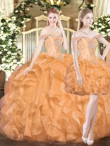 Three Pieces Quinceanera Gowns Orange Red Off The Shoulder Organza Sleeveless Floor Length Lace Up