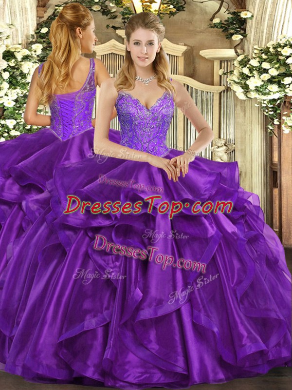 Top Selling Ball Gowns Quinceanera Dresses Eggplant Purple Straps Organza Sleeveless Floor Length Lace Up