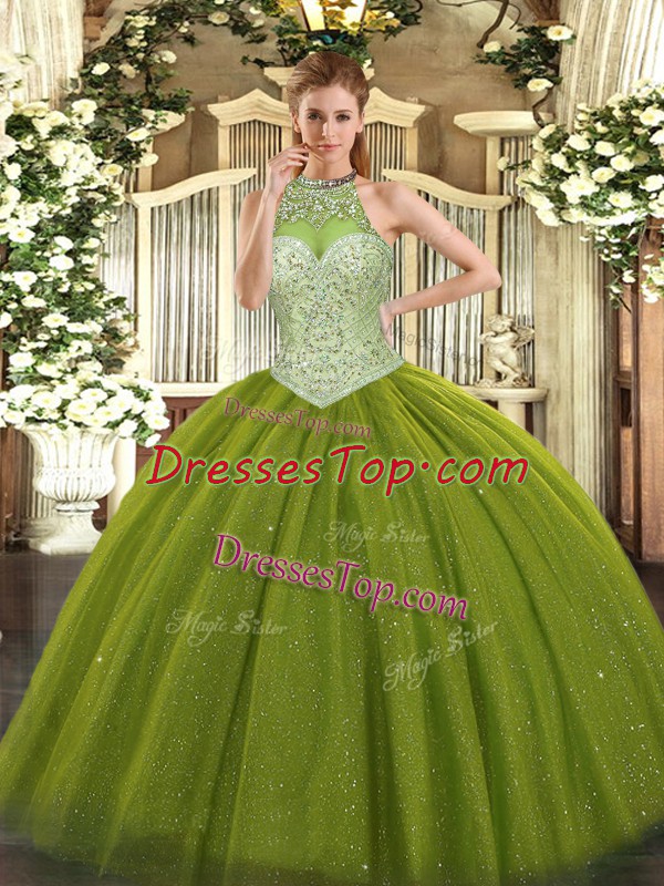 Top Selling Olive Green Sleeveless Tulle Lace Up Quinceanera Dress for Military Ball and Sweet 16 and Quinceanera