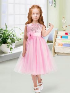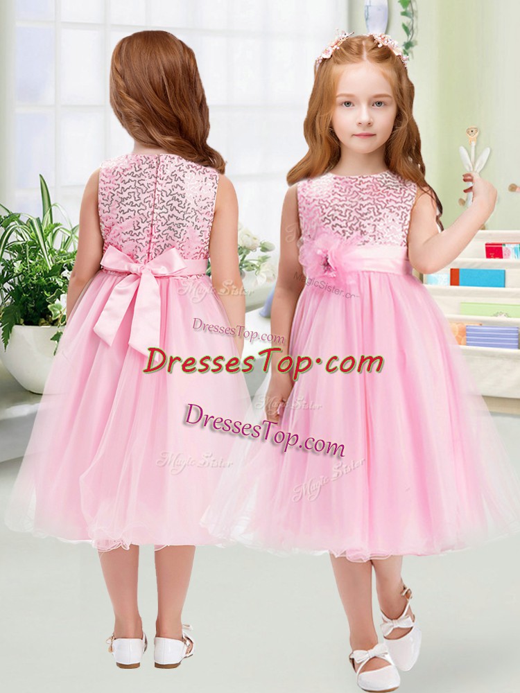 Top Selling Organza Sleeveless Tea Length Little Girl Pageant Dress and Sequins and Hand Made Flower