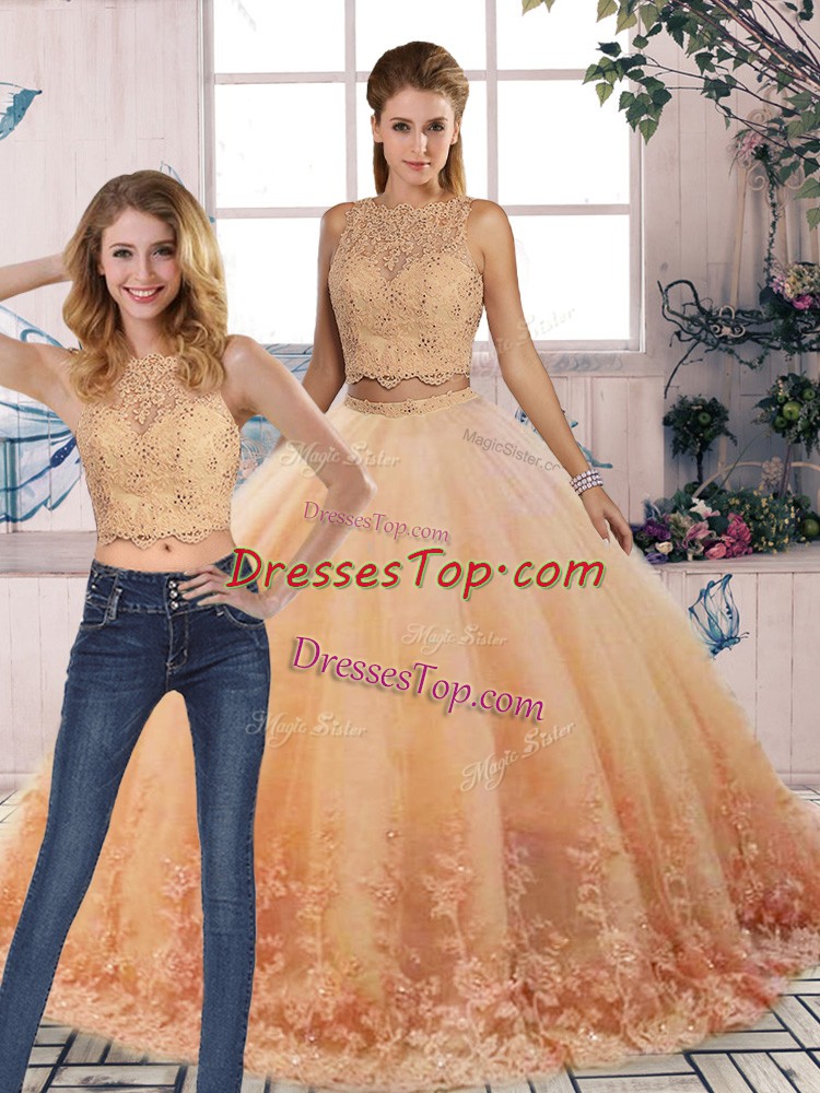 Top Selling Peach Backless Scalloped Lace Sweet 16 Dress Tulle Sleeveless Sweep Train