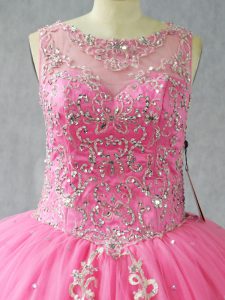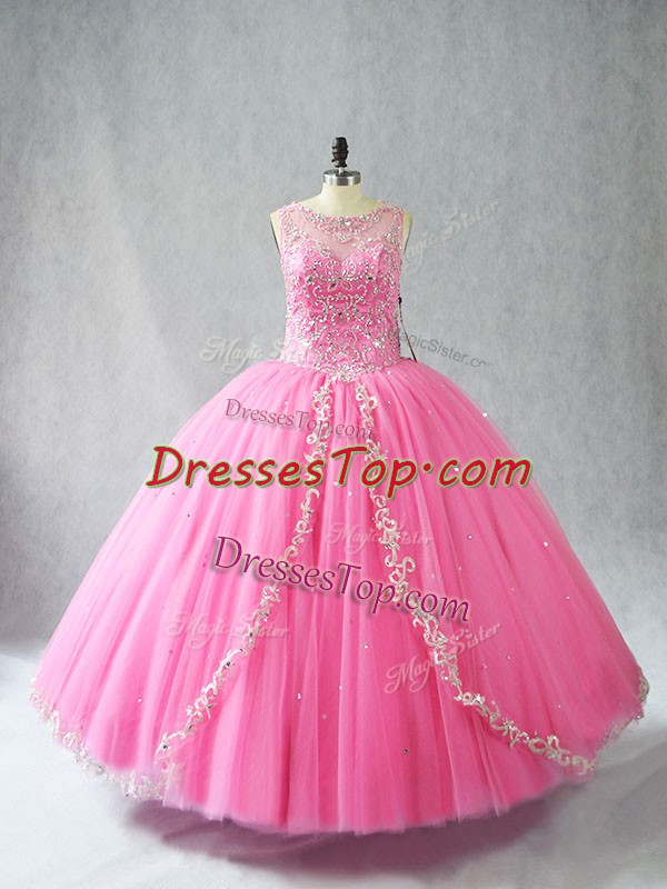 Top Selling Rose Pink Lace Up Scoop Beading and Appliques 15 Quinceanera Dress Tulle Sleeveless