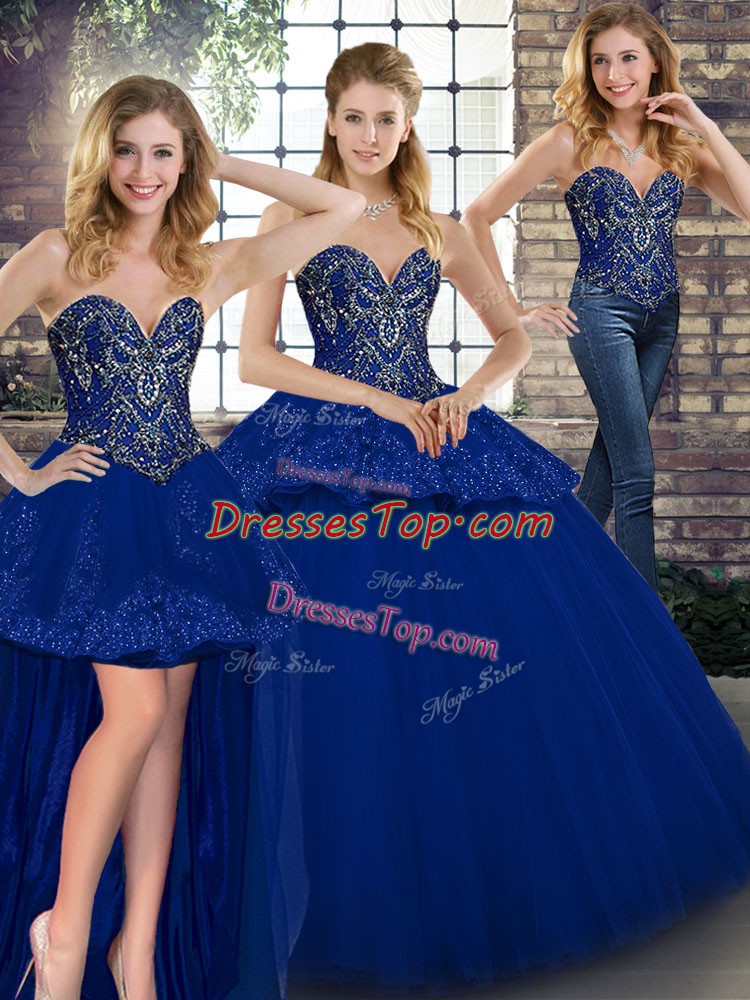 Top Selling Royal Blue Three Pieces Tulle Sweetheart Sleeveless Beading and Appliques Floor Length Lace Up Sweet 16 Dress