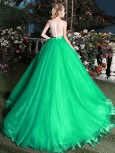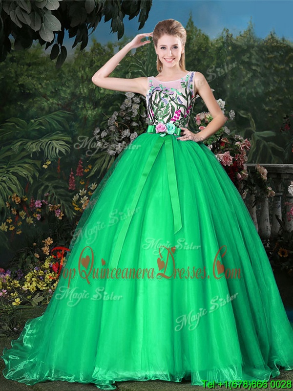 Top Selling Scoop Green Sleeveless Organza Brush Train Zipper 15th Birthday Dress for Military Ball and Sweet 16 and Quinceanera