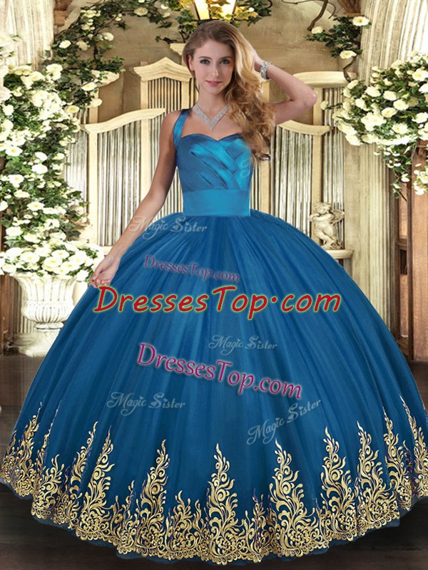 Top Selling Sleeveless Floor Length Appliques Lace Up Quinceanera Dress with Blue