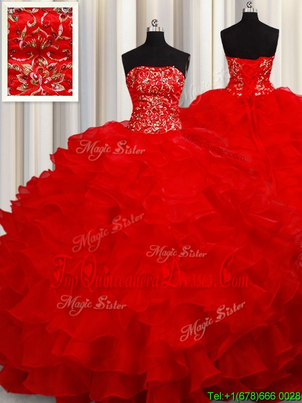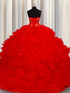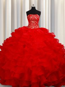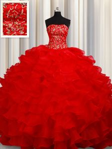 Top Selling Sleeveless Floor Length Beading and Embroidery and Ruffles Lace Up Quince Ball Gowns with Red