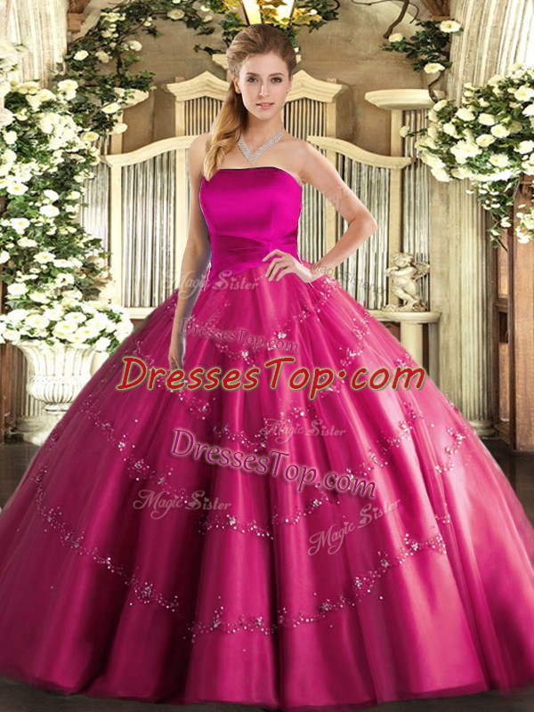 Top Selling Sleeveless Tulle Floor Length Lace Up Vestidos de Quinceanera in Hot Pink with Appliques