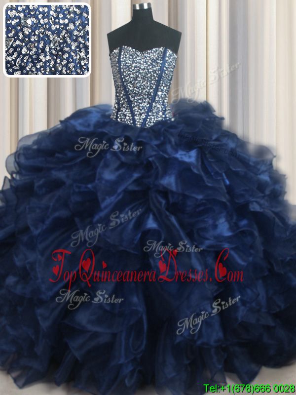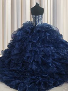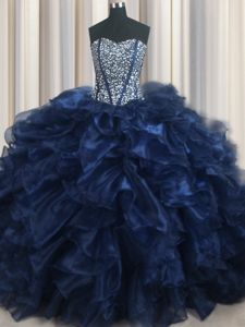 Top Selling Visible Boning Bling-bling Navy Blue Lace Up Ball Gown Prom Dress Beading and Ruffles Sleeveless With Brush Train