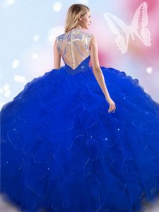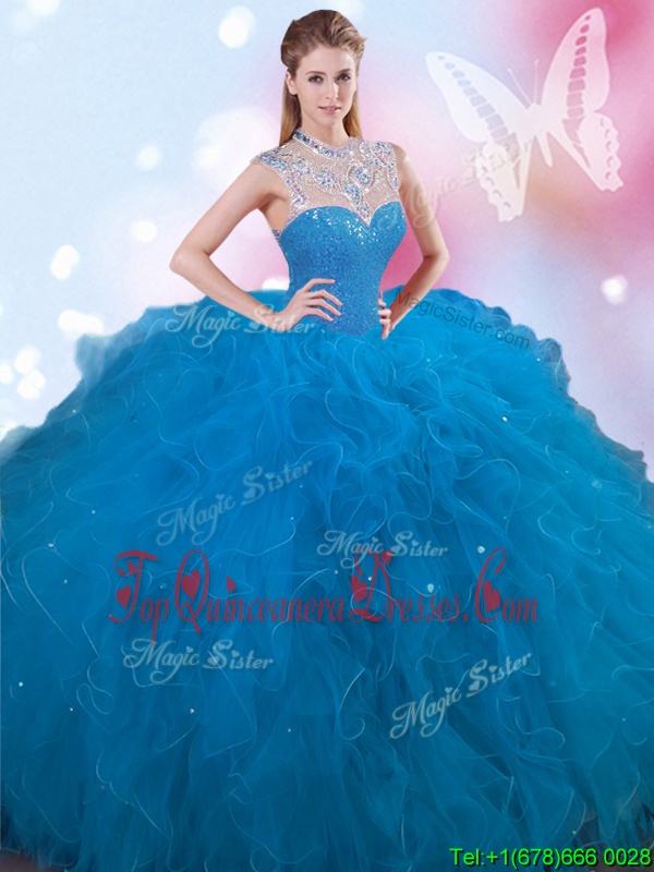 Traditional Blue High-neck Lace Up Beading Quinceanera Dress Sleeveless