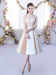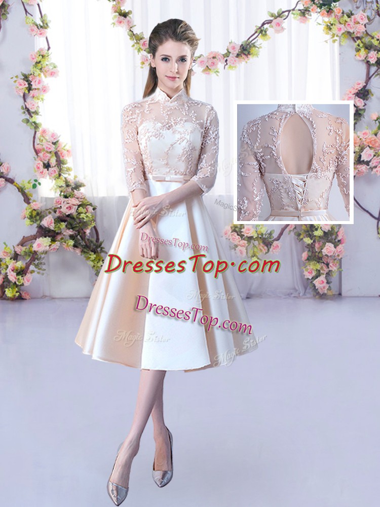 Traditional Champagne Half Sleeves Tea Length Lace and Belt Lace Up Dama Dress