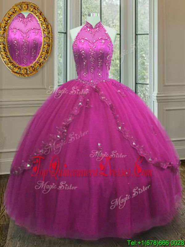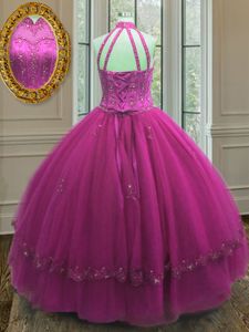 Traditional Floor Length Fuchsia Quinceanera Gowns High-neck Sleeveless Lace Up