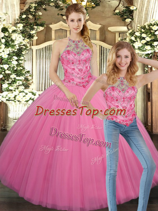 Traditional Floor Length Lace Up Sweet 16 Dress Rose Pink for Sweet 16 and Quinceanera with Embroidery