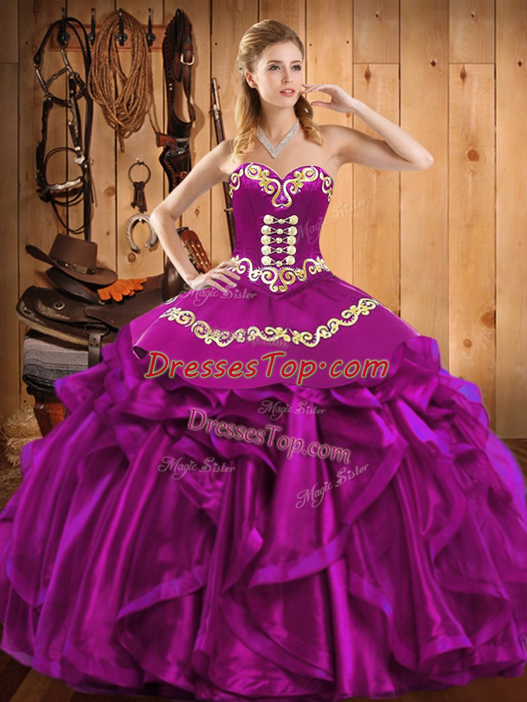 Traditional Fuchsia Sweetheart Lace Up Embroidery and Ruffles Quinceanera Dress Sleeveless