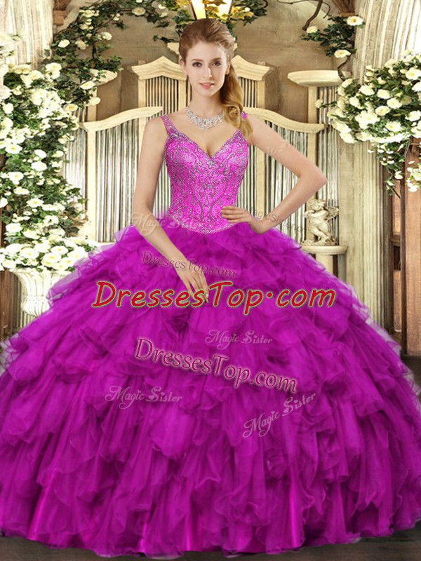 Traditional Fuchsia V-neck Neckline Beading and Ruffles 15th Birthday Dress Sleeveless Lace Up