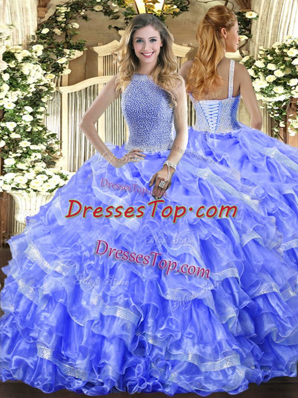 Traditional High-neck Sleeveless Quince Ball Gowns Floor Length Beading and Ruffled Layers Blue Organza