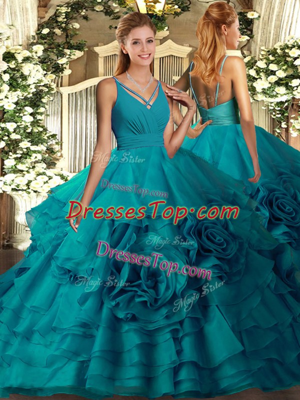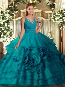 Traditional Sleeveless Floor Length Ruffles Backless Ball Gown Prom Dress with Teal