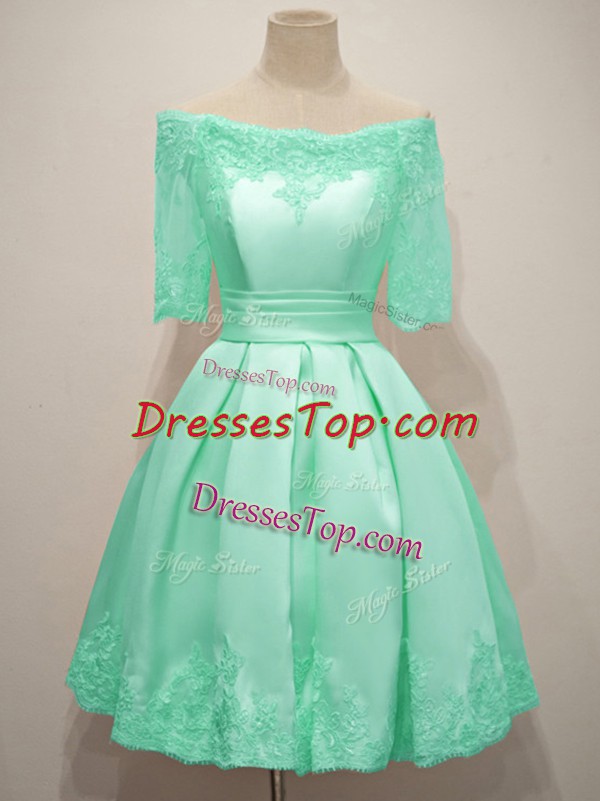 Traditional Turquoise A-line Taffeta Off The Shoulder Half Sleeves Lace Knee Length Lace Up Damas Dress