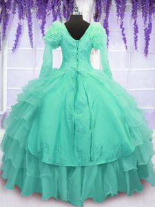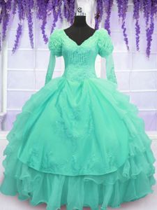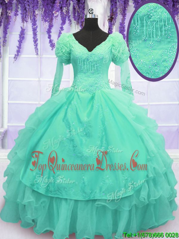 Traditional Turquoise Ball Gowns Beading and Embroidery and Hand Made Flower Sweet 16 Dress Lace Up Organza Long Sleeves Floor Length