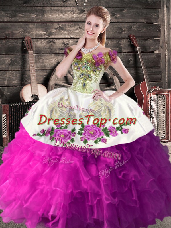 Traditional White And Purple Ball Gowns Off The Shoulder Sleeveless Organza Floor Length Lace Up Embroidery and Ruffles Quinceanera Gown