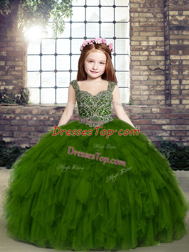 Trendy Ball Gowns Kids Formal Wear Olive Green Straps Tulle Sleeveless Floor Length Lace Up