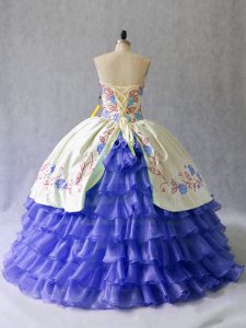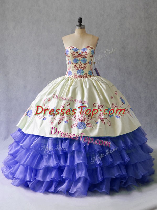 Trendy Blue Satin and Organza Lace Up Sweetheart Sleeveless Floor Length Sweet 16 Dress Beading and Embroidery