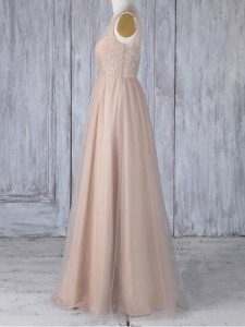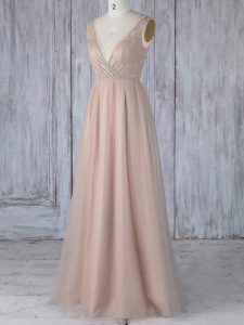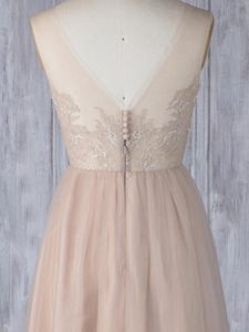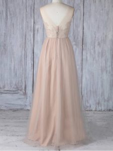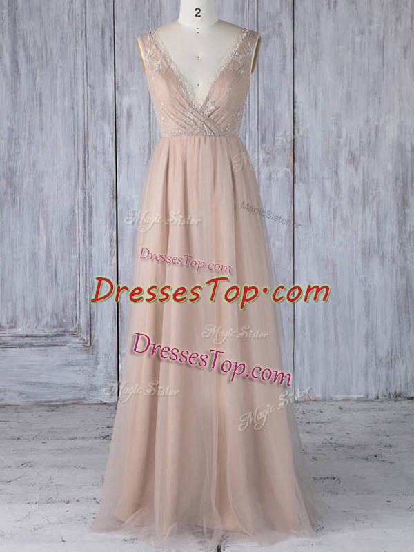 Trendy Empire Dama Dress Peach V-neck Tulle Sleeveless Floor Length Zipper
