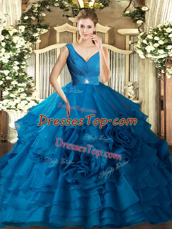 Trendy Floor Length Blue Vestidos de Quinceanera V-neck Sleeveless Backless