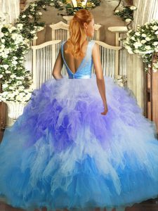 Trendy Multi-color Backless Scoop Lace and Ruffles Quinceanera Gown Organza Sleeveless