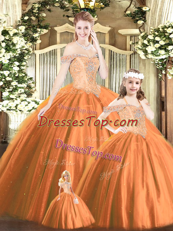 Trendy Off The Shoulder Sleeveless Quinceanera Dress Floor Length Beading Orange Red Tulle
