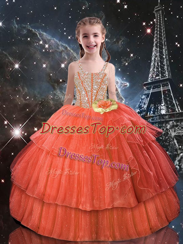 Trendy Orange Red Lace Up Pageant Dress Wholesale Beading and Ruffled Layers Short Sleeves Floor Length