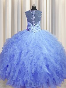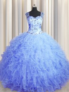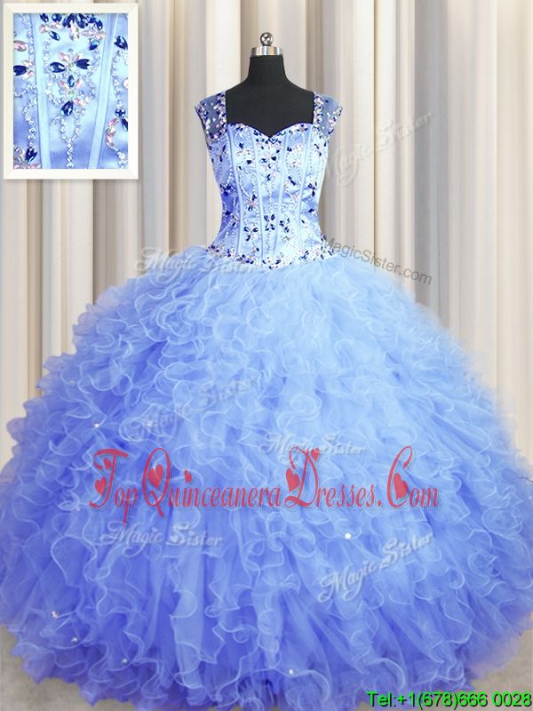 Trendy See Through Zipper Up Ball Gowns Quinceanera Gown Light Blue Square Tulle Sleeveless Floor Length Zipper