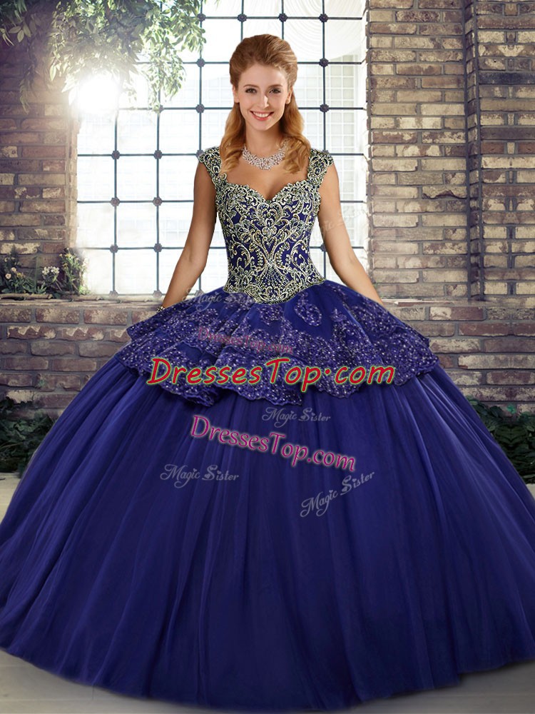 Trendy Sleeveless Floor Length Beading and Appliques Lace Up Quinceanera Gown with Purple