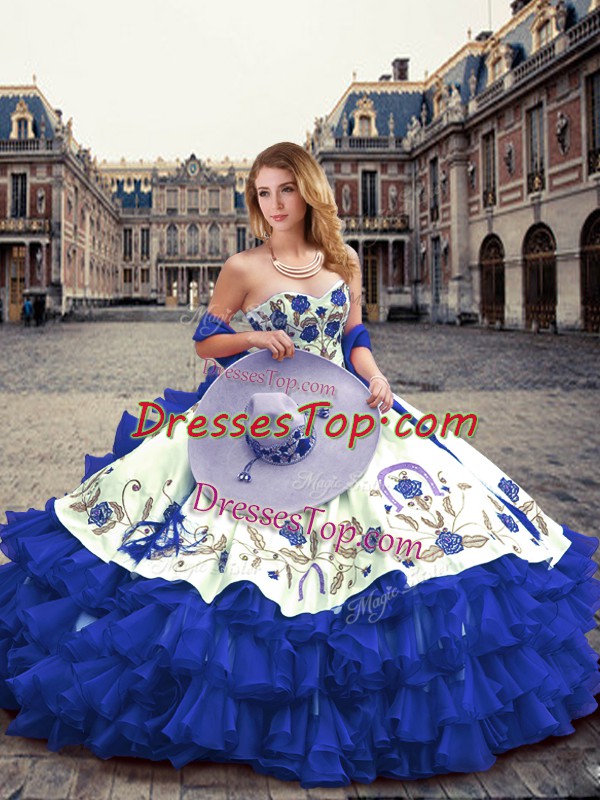 Trendy Sleeveless Floor Length Embroidery and Ruffled Layers Lace Up Vestidos de Quinceanera with Royal Blue