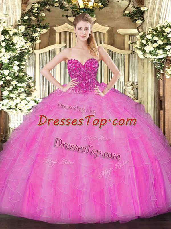 Trendy Sleeveless Organza Floor Length Lace Up 15 Quinceanera Dress in Fuchsia with Beading and Ruffles