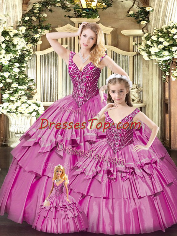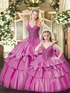 Trendy Sleeveless Organza Floor Length Lace Up Ball Gown Prom Dress in Fuchsia with Beading and Ruffled Layers