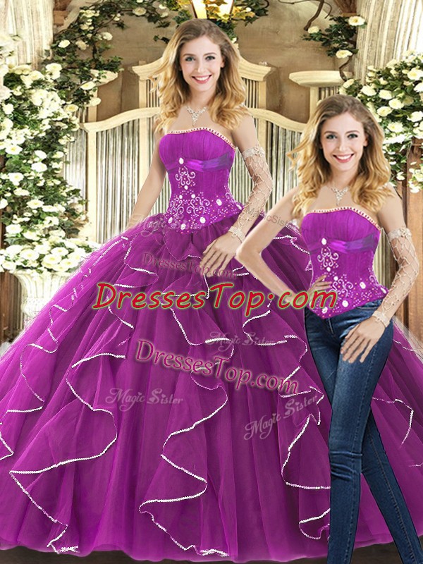 Trendy Strapless Sleeveless 15 Quinceanera Dress Beading and Ruffles Purple Tulle