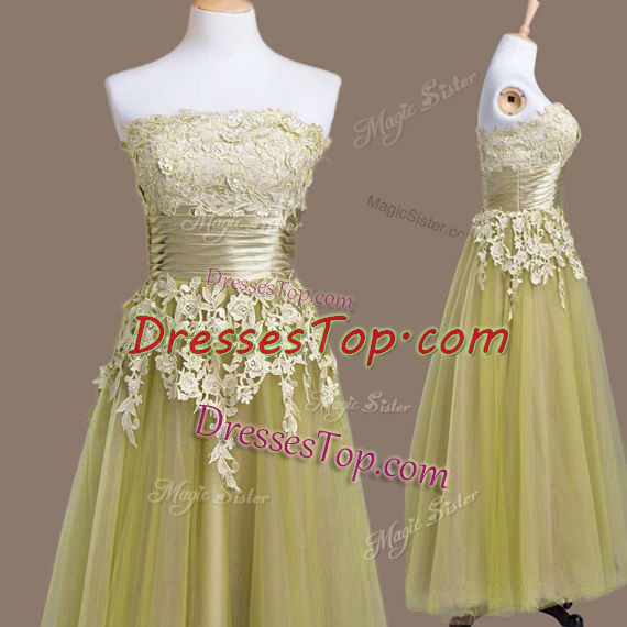 Trendy Tea Length Lace Up Vestidos de Damas Olive Green for Prom and Party and Wedding Party with Appliques