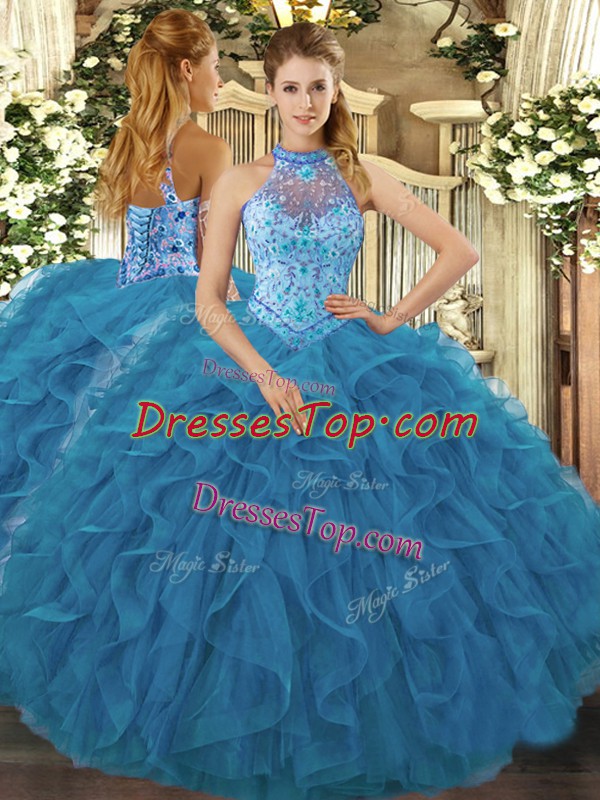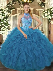 Trendy Teal Sleeveless Embroidery and Ruffles Floor Length 15th Birthday Dress