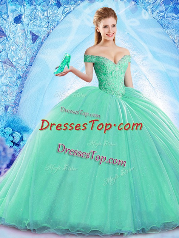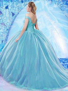Trendy Turquoise Sleeveless Brush Train Beading Quinceanera Dress