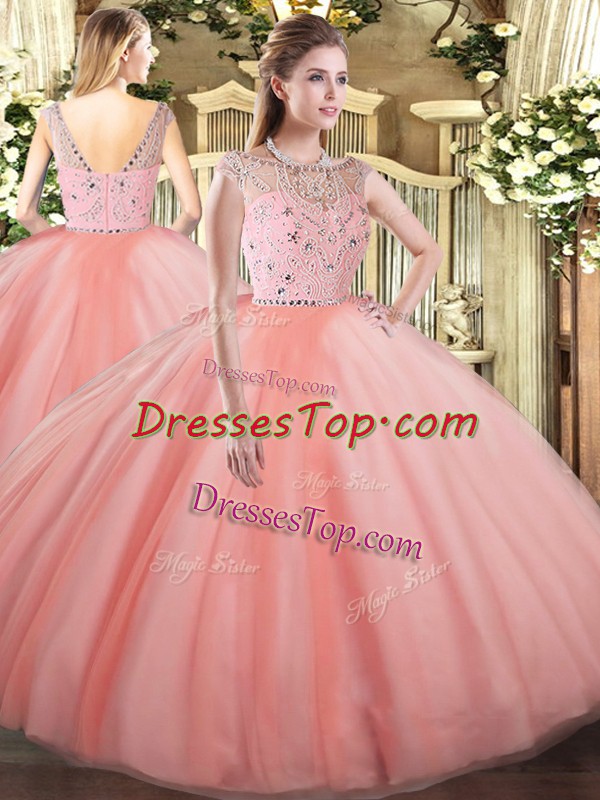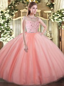 Tulle Bateau Sleeveless Zipper Beading Vestidos de Quinceanera in Peach
