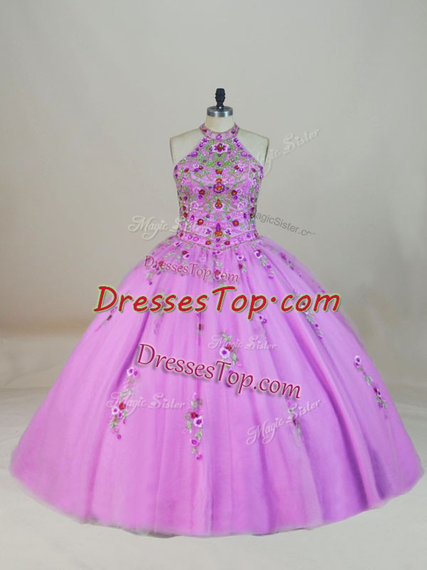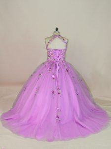 Tulle Halter Top Sleeveless Brush Train Lace Up Appliques and Embroidery Quinceanera Dresses in Lilac