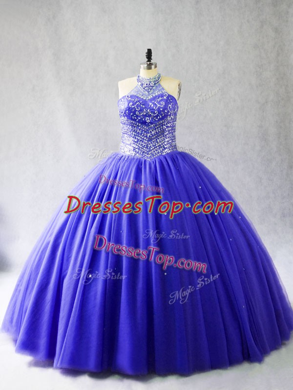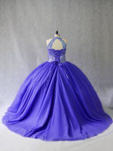 Tulle Halter Top Sleeveless Brush Train Lace Up Beading Quince Ball Gowns in Blue