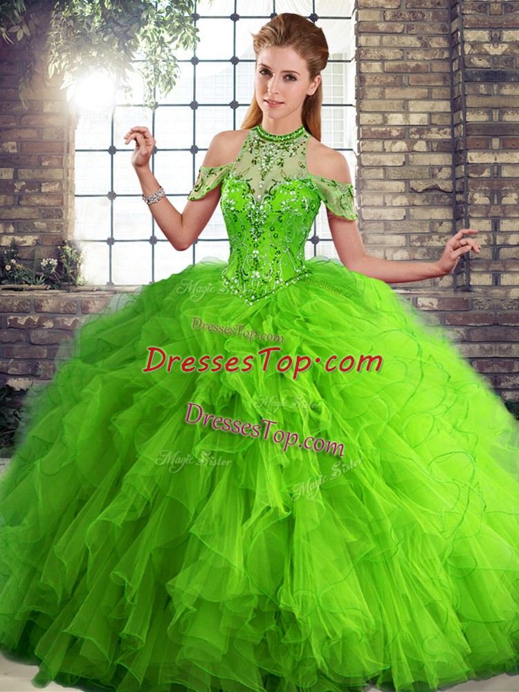 Tulle Halter Top Sleeveless Lace Up Beading and Ruffles 15th Birthday Dress in Green